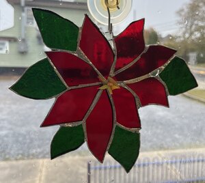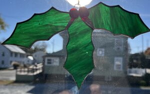 You will enjoy this pretty holly sun catcher all year long. I will prepare the glass and teach you how to wrap and solder your project.