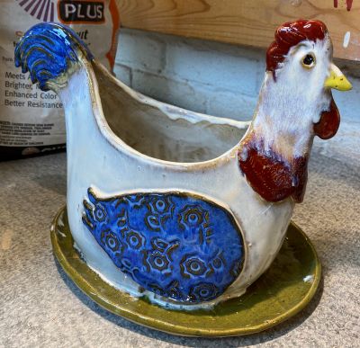 This cute planter will add color to your plant table! During this workshop, you will create your own chicken planter out of clay using our original templates. The cost of the workshop includes your second visit for glazing.